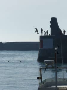 Baignade dans l'avant port. Des enfants sautent depuis la jetée